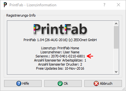 Geben Sie die Seriennummer Ihrer PrintFab-Lizenz ein(in der PrintFab Toolbox - siehe Abbildung). Alternativ können Sie auch die Rechnungs- oder Keyfilenummer eingeben.
